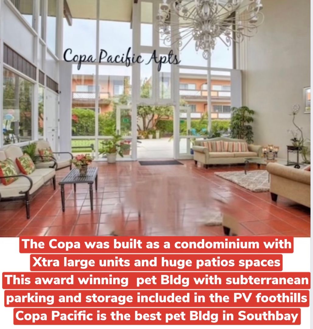 An award-winning pet building in South Torrance and the foothills of Palos Verdes in the marine envelope of air off the Pacific Ocean 5 minutes to our private beach. Originally built as condos with subterranean parking, amenities storage and landscaped areas abound, with extra-large private patios balconies and private entryways seldom found now.