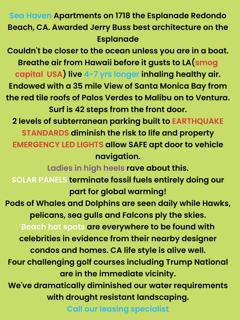 Sea Haven Apts at 1718 Esplanade, built by Laker owner Jerry Buss won the esplanade beauty contest many times over known for its large balconies with 35 mile VU’s of SM bay from red tile roofs of PV to Esplanade, KH Marina to the Malibu colony on to Ventura. Rarely available Corporate suites start at $3800/mo and Apt units $2950
