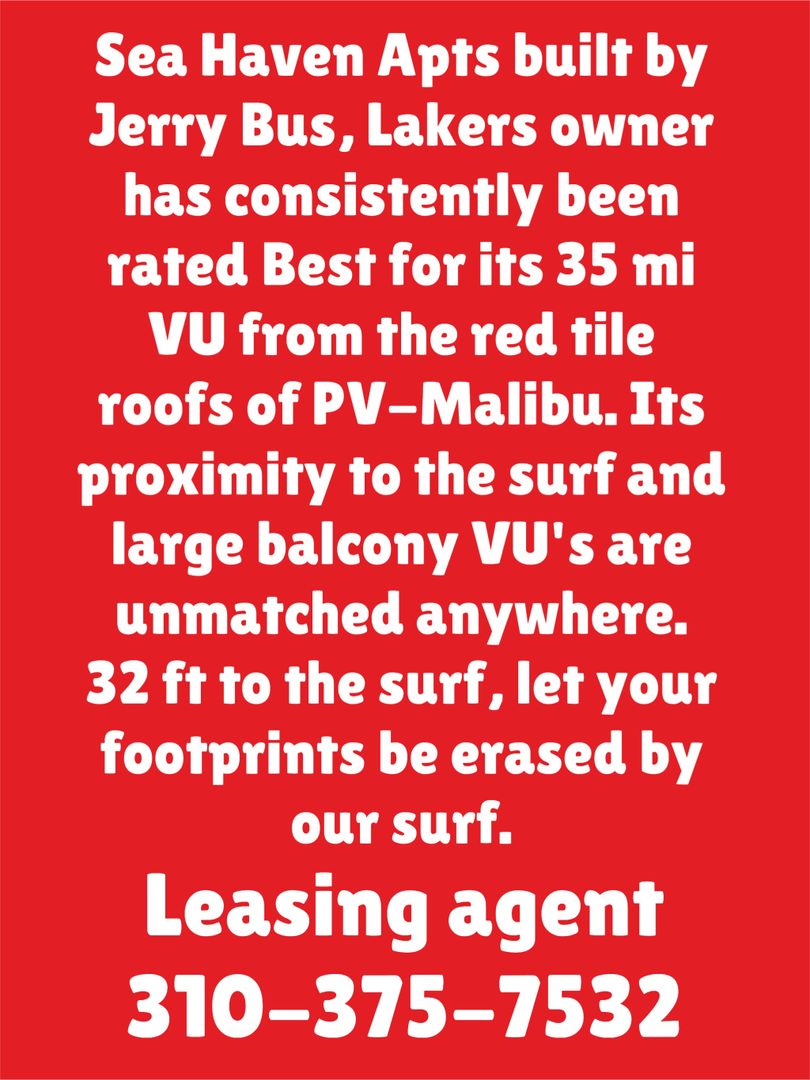 Endowed with a 35 mile View of Santa Monica Bay from the red tile roofs of Palos Verdes to Malibu on to Ventura. Beach Bike path voted best in CA is in the front yard of this Building where walkers, joggers bikers sail kiters and bench warmers are to be found.