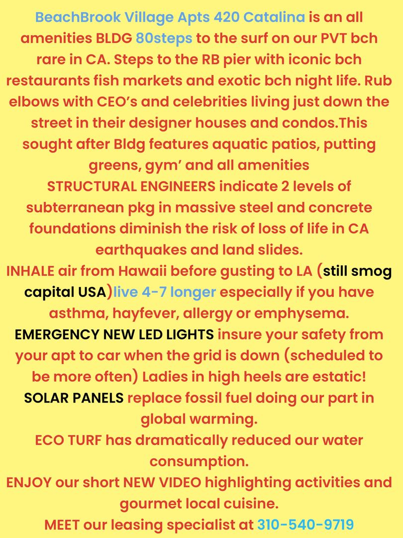 BeachBrook Village Apts 420 Catalina is an all amenities BLDG 80steps to the surf on our PVT bch rare in CA. Steps to the RB pier with iconic bch restaurants fish markets and exotic bch night life. Rub elbows with CEO’s and celebrities living just down the street in their designer houses and condos.This sought after Bldg features aquatic patios, putting greens, gym’ and all amenities