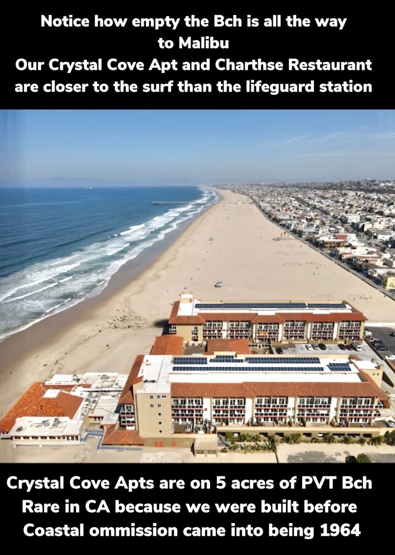 This is our flagship building: Here at Crystal Cove life at our beach is a rare privilege for those questing for the healthiest lifestyle in LA County. Welcome to whitewater paradise. Breathe air from Hawaii before it gusts to LA(smog capital of USA) live 3-5 yrs longer inhaling healthy air. Quality of life improved immensely if you have hay fever, asthma, allergy, and emphysema.CA rated#1 beach bike path. Every bldg has been earthquake Retrofit or has huge amounts of steel and concrete dedicated to the parking structures which diminishes the risk to life and property during a CA earthquake.