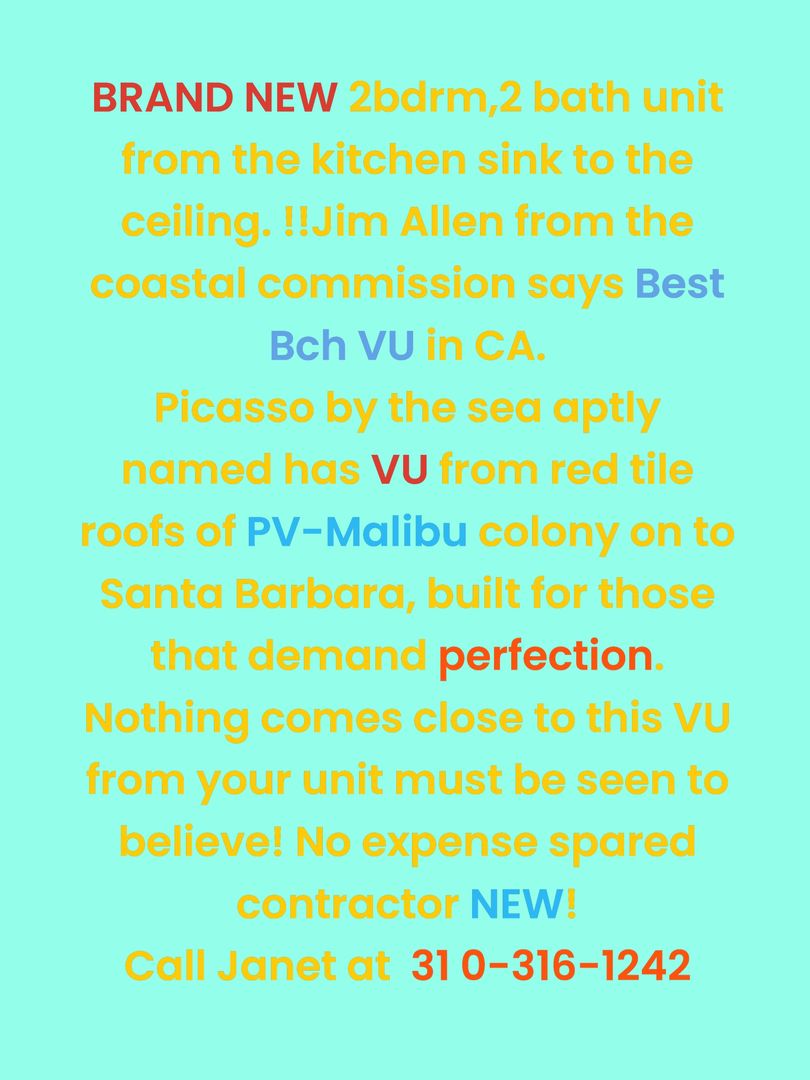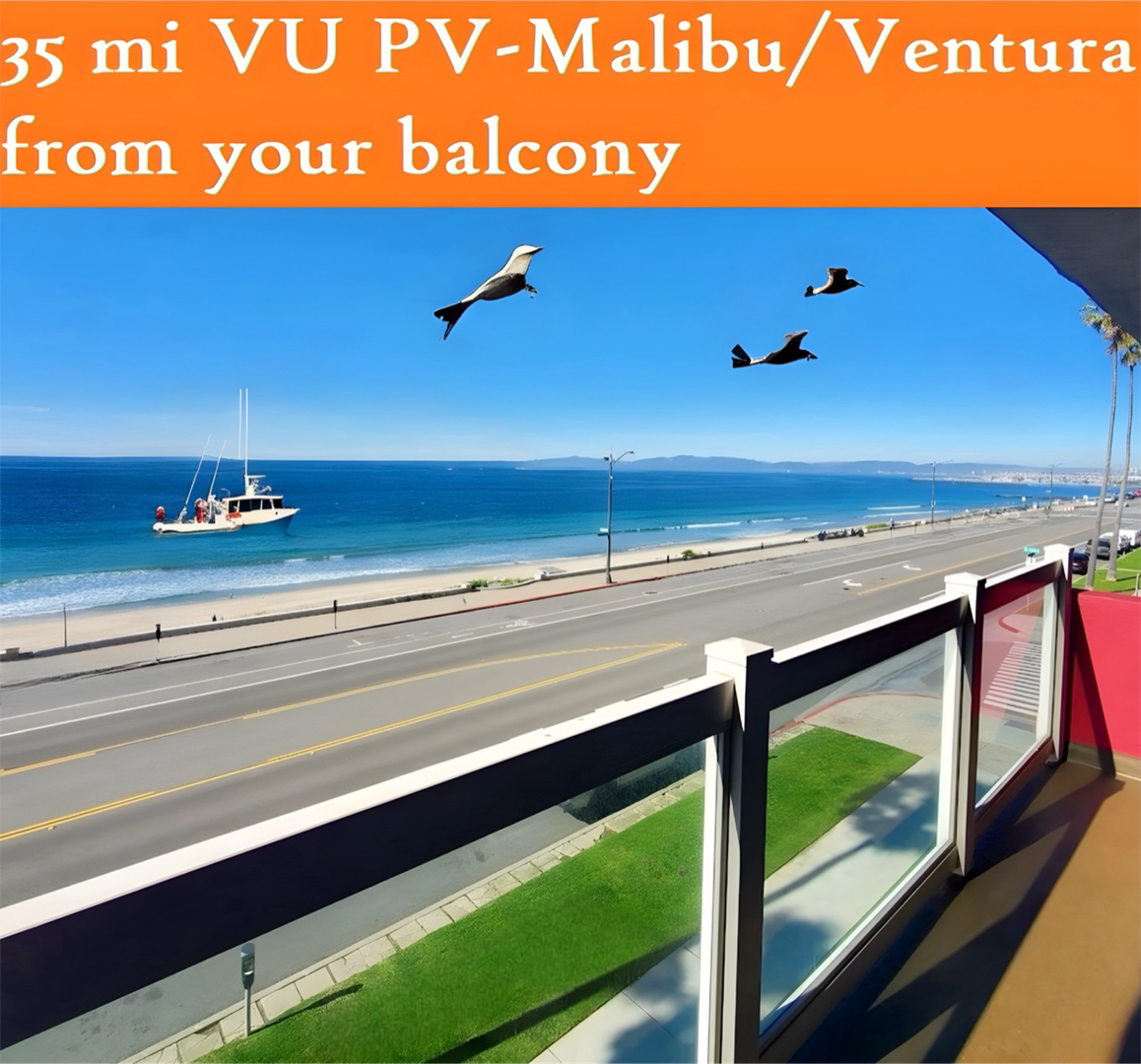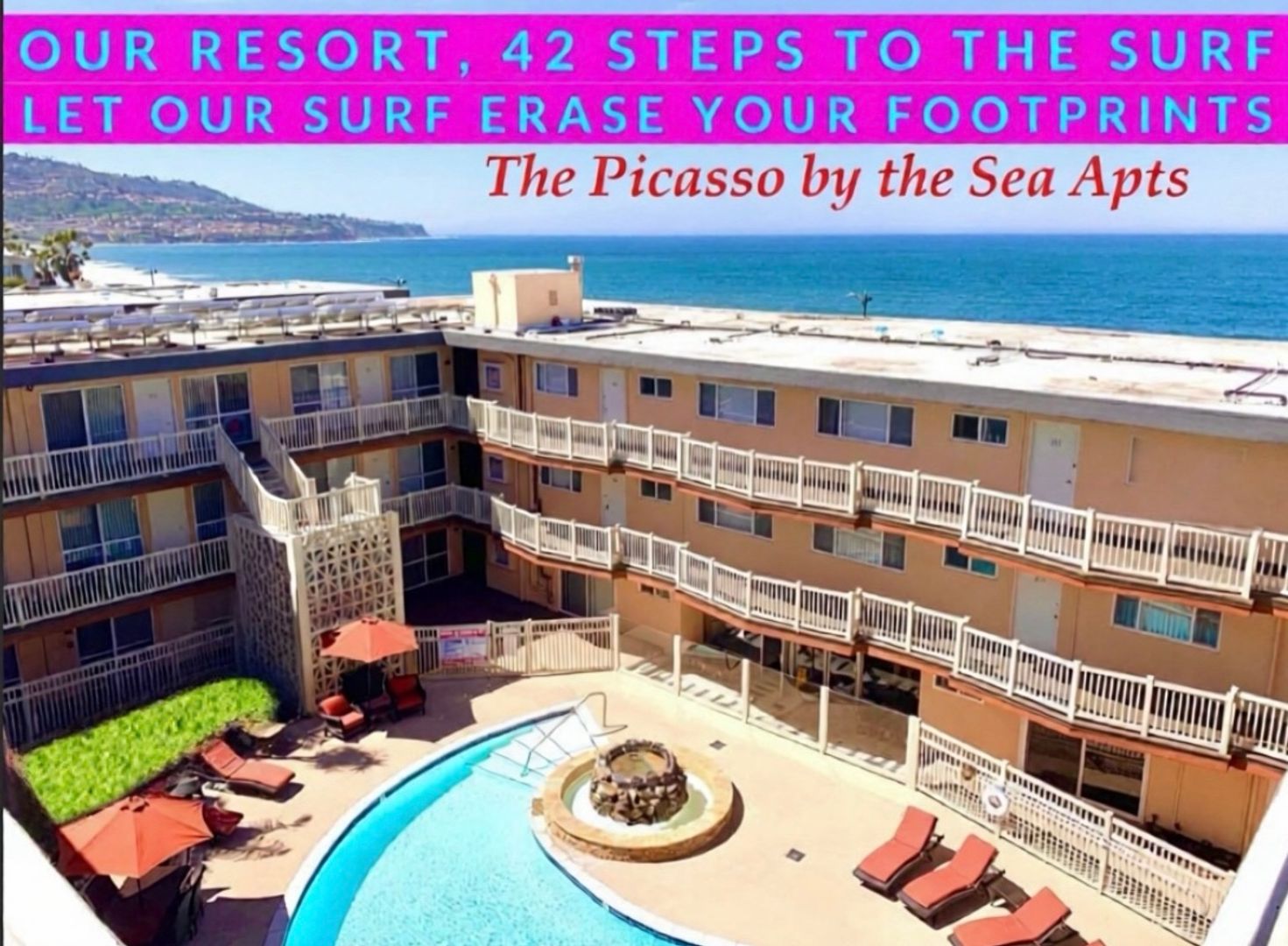 Picasso 1200 Esplanade Redondo Bch by the sea is well known as an iconic Esplanade apt with a rendering of Pablo Picasso above the entry, which passerby’s rave about. Bldg  is 42 steps to the surf and 35 mile VU’s of SM bay from red tile roofs of PV to Esplanade, KH Marina to the Malibu colony on to Ventura. corporate suites start at $6700/mo and Apt units at $2950. Celebrities live just down the street in their designer homes and condos.
